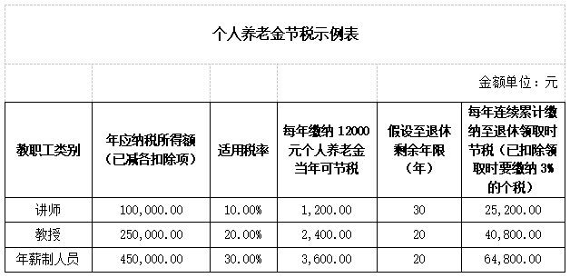 按现行税法规定,个人养老金每年缴存上限12000元,可据实扣除个人应纳税所得额,直接降低当期税负;个人养老金账户投资收益暂不征税,领取时按3%优惠税率缴纳个税。以2024年度综合所得测算,开通个人养老金账户并缴费对我校绝大部分教职工有节税效应,示例如下: