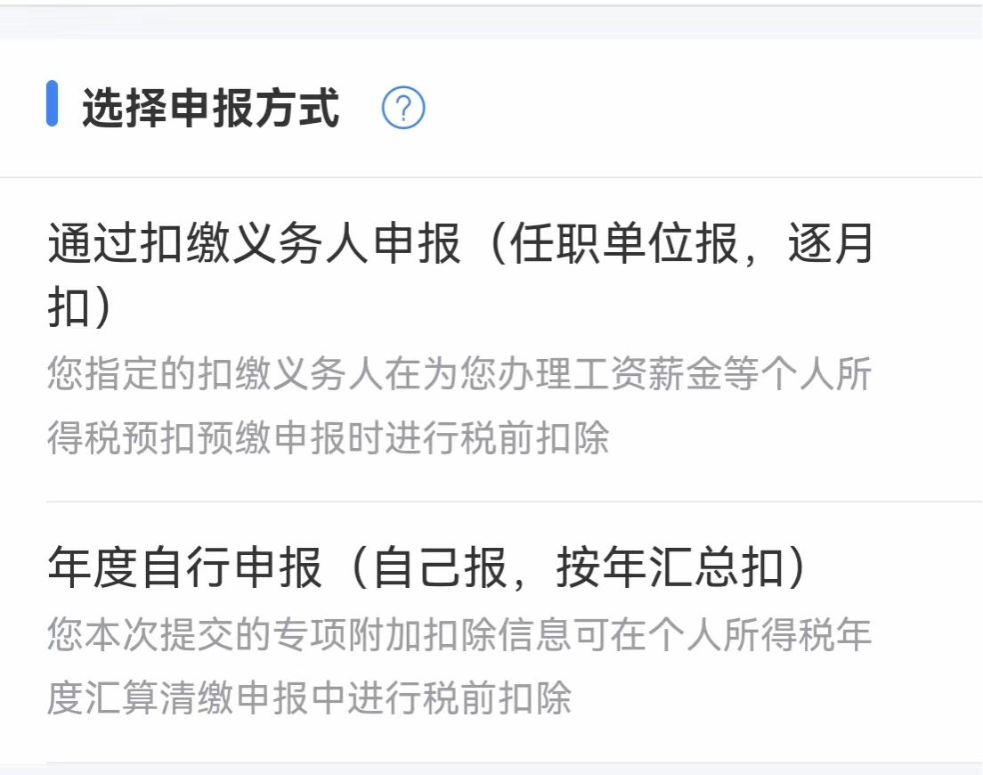 当填报专项附加扣除信息时,在“申报方式”一栏会出现下图两种选择: