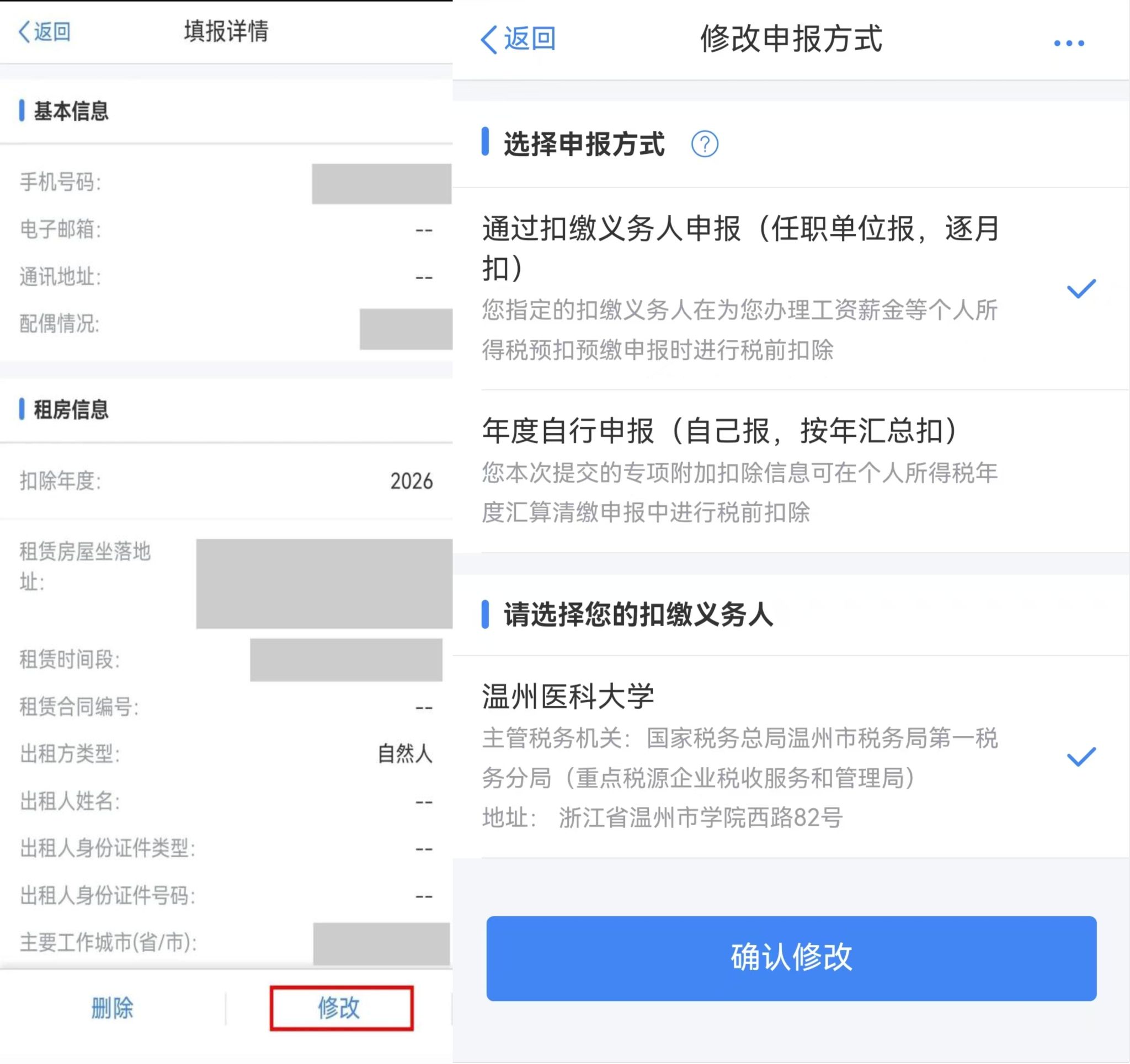 以修改住房租金专项附加扣除为例:在待确认扣除信息界面,点击【修改】——【修改申报方式】——【通过扣缴义务人申报(任职单位报,逐月扣)】和【温州医科大学】(主体收入在温州医科大学的教职工)——【确定修改】即可完成修改。